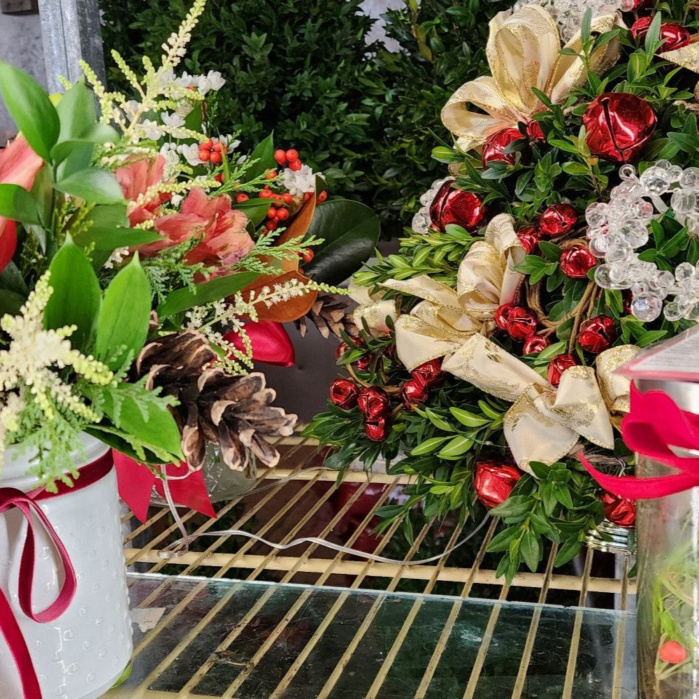 A festive long and low arrangement with fresh seasonal greens, cones and beautiful assortment of holiday flowers.